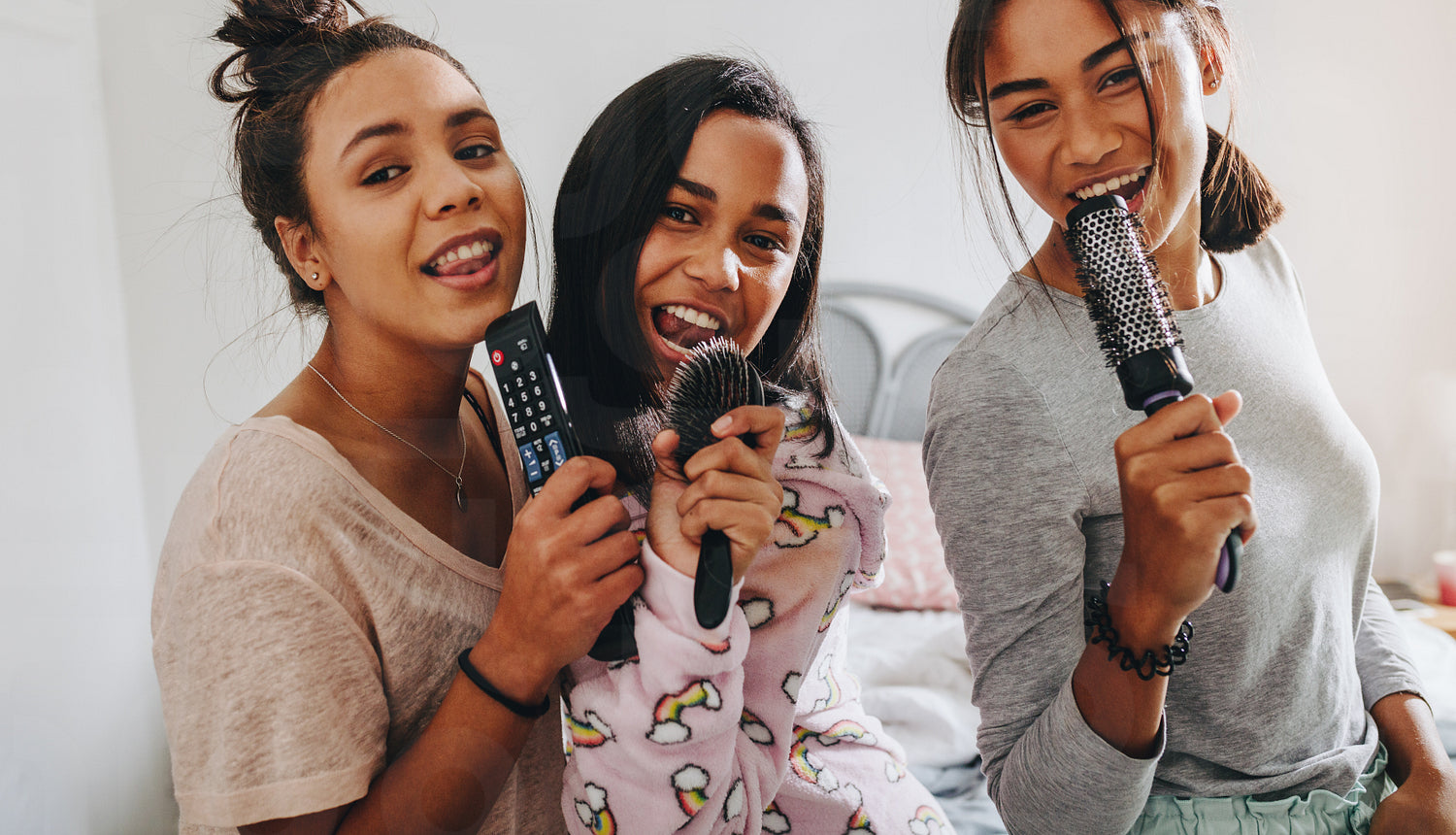 Happy young girls having fun singing songs in karaoke style holding hair brushes and remote control. Girls at a sleepover having fun singing together.