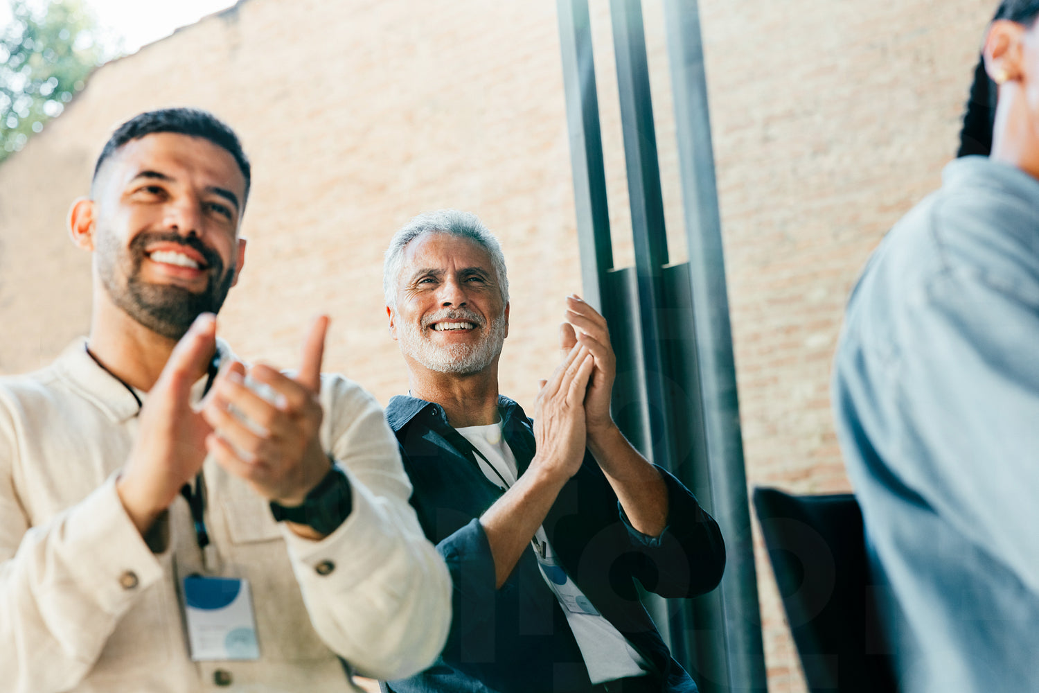 Adults clapping and smiling while praising colleagues in a smart-casual setting. The group is standing and displaying positive engagement.