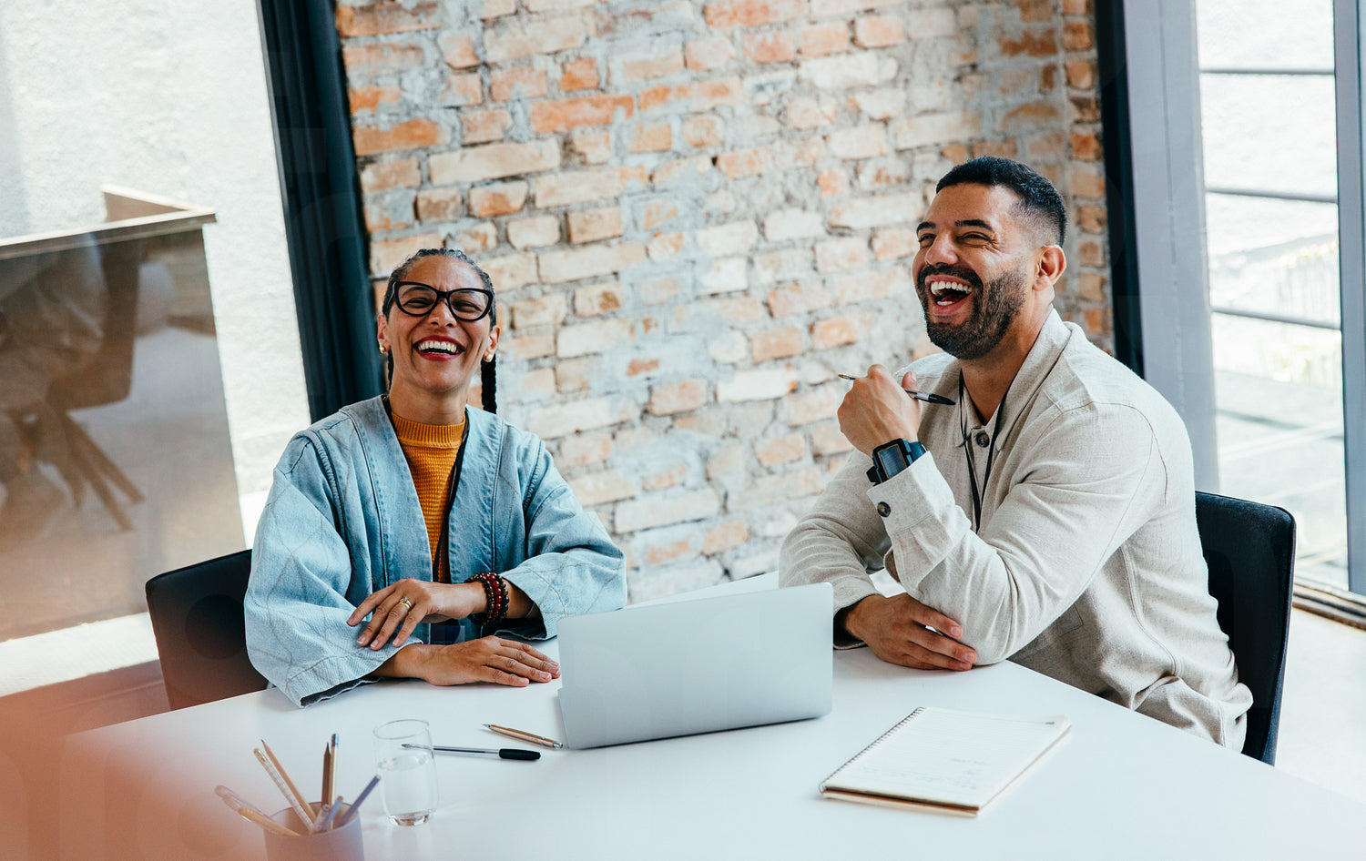 Two professionals laughing during a business meeting in a sophisticated business environment, showcasing a positive and collaborative work atmosphere.