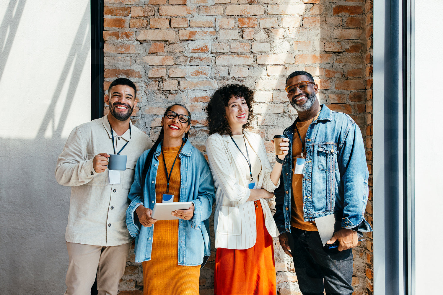 Group of employees enjoying a casual coffee break with brick wall background