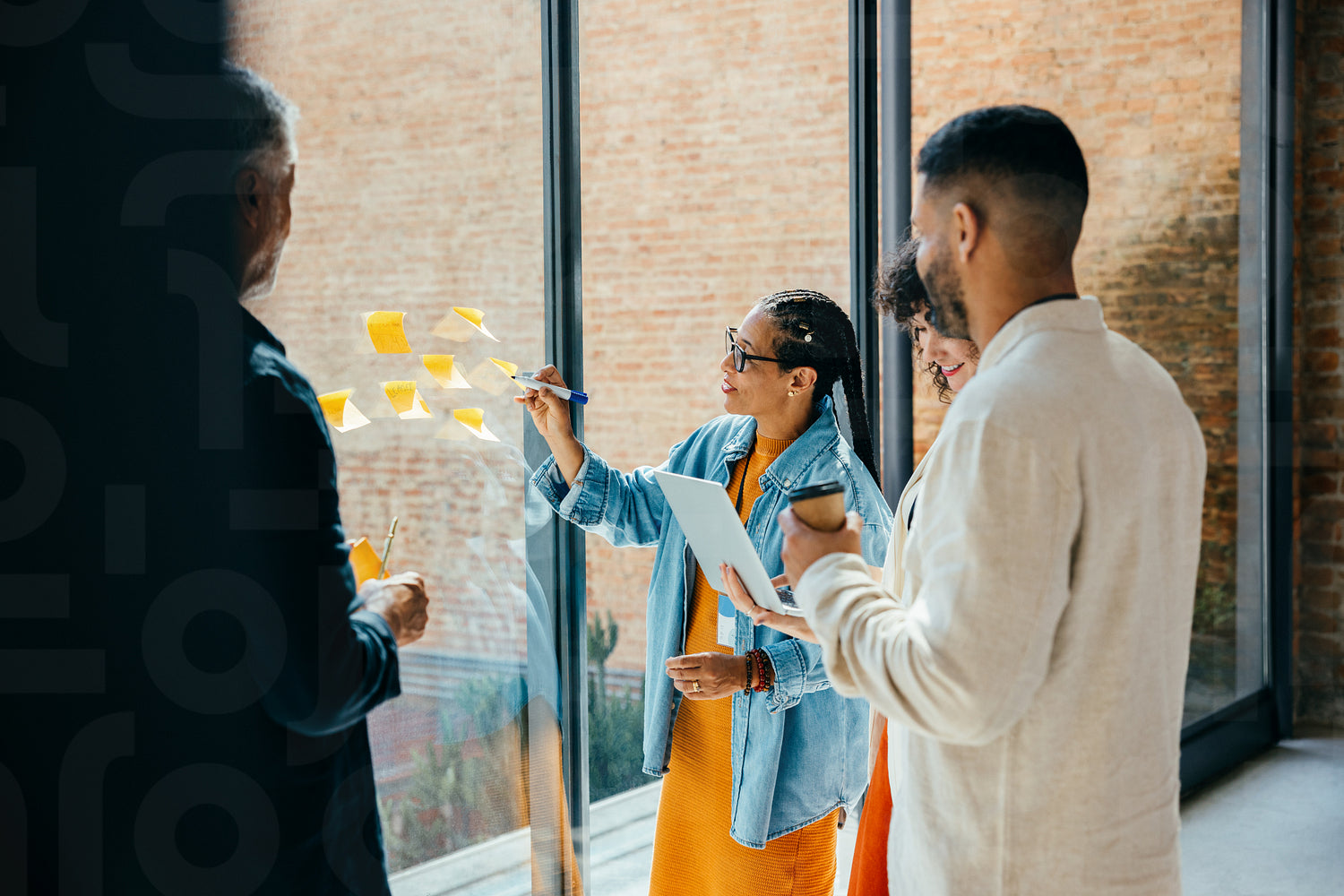 Informal business meeting with diverse team brainstorming with sticky notes in a modern office setting