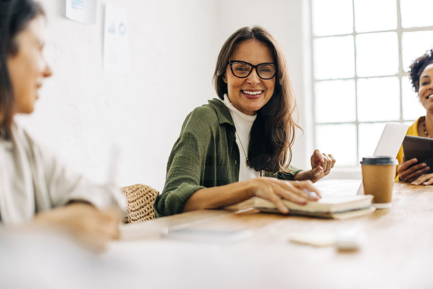 Successful business woman smiling confidently at the camera, engaged in a team meeting with her colleagues in a boardroom. Group of female entrepreneurs working as a team to grow their startup.