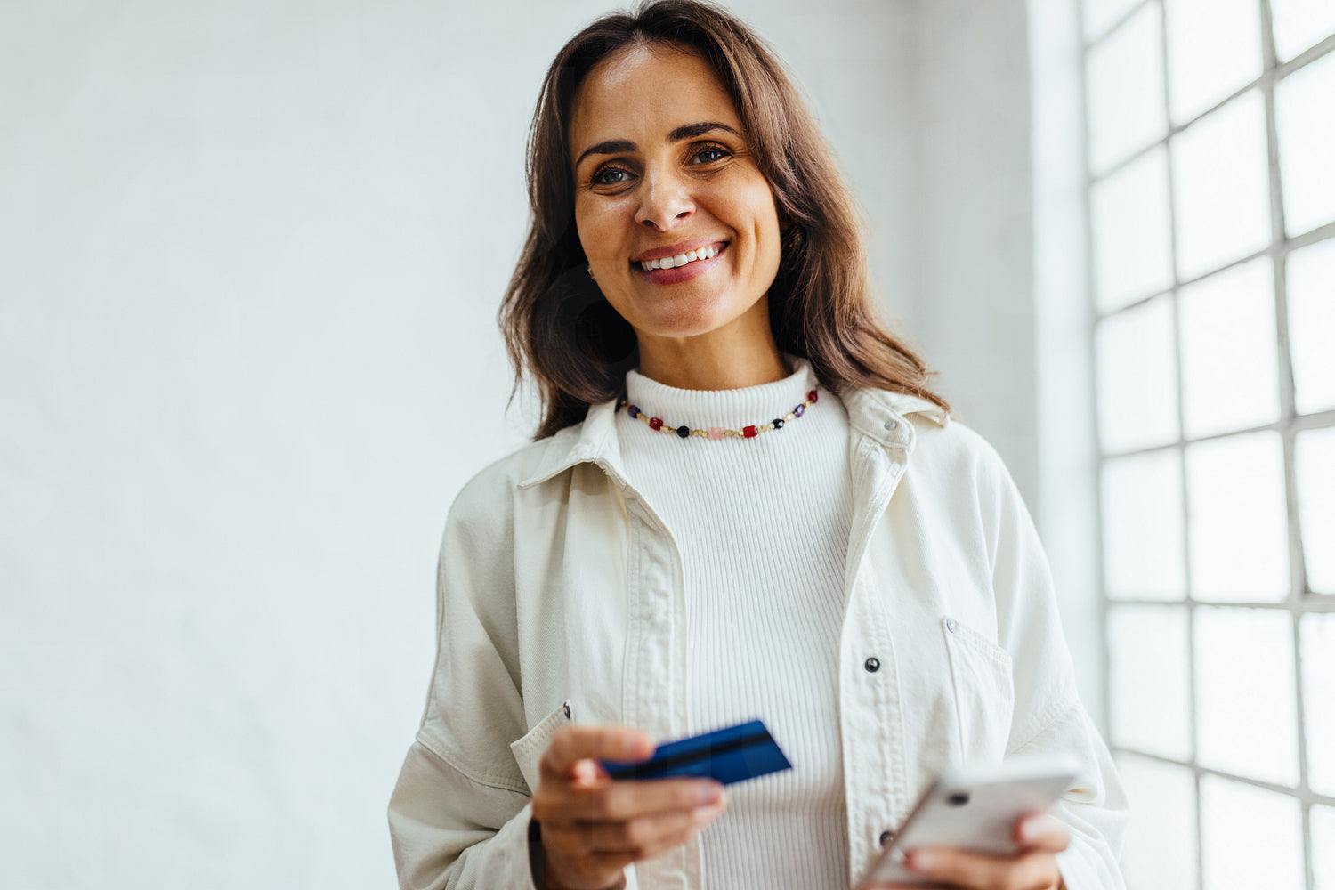 Business woman smiling as she uses her credit card for mobile payments with a smartphone. Happy female entrepreneur using electronic banking for the growth of her startup.