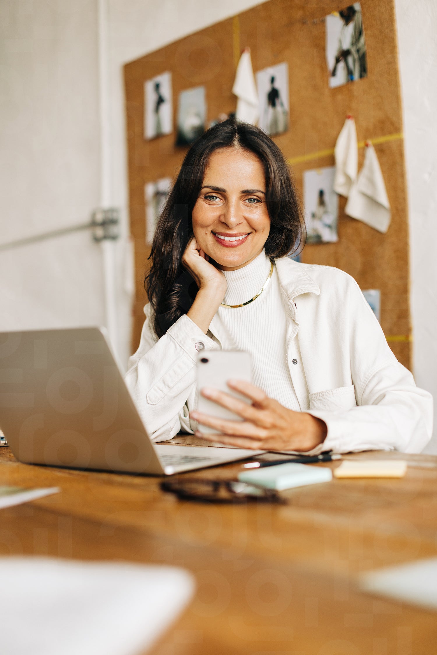 Creative fashion designer and business woman sits in her office, smiling and looking at the camera with confidence. Happy business woman using a smartphone and laptop to manage a small design startup.