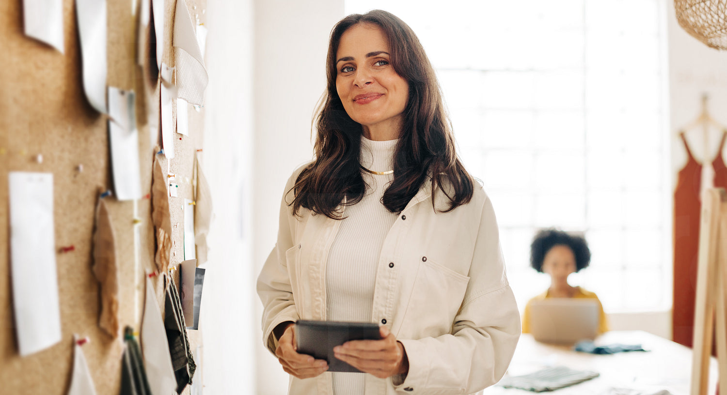 Thoughtful business woman stands in her boutique, looking away and smiling while holding a digital tablet. She is an entrepreneur and fashion designer who enjoys the creative work of her occupation.