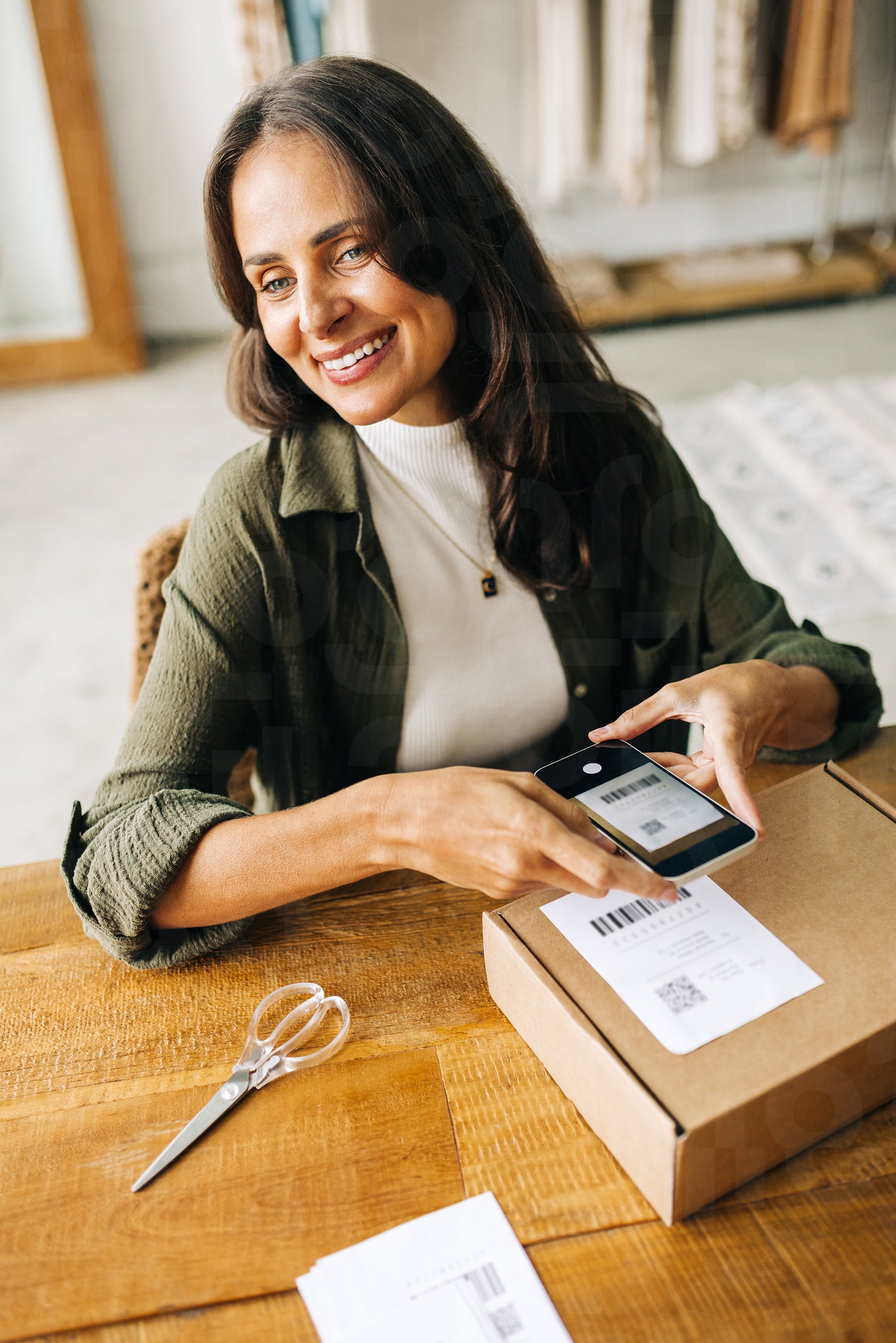 Happy online store owner uses her mobile scanner app to fulfil clothing orders, ensuring that every package is shipped out accurately in order to drive the success of her ecommerce business.
