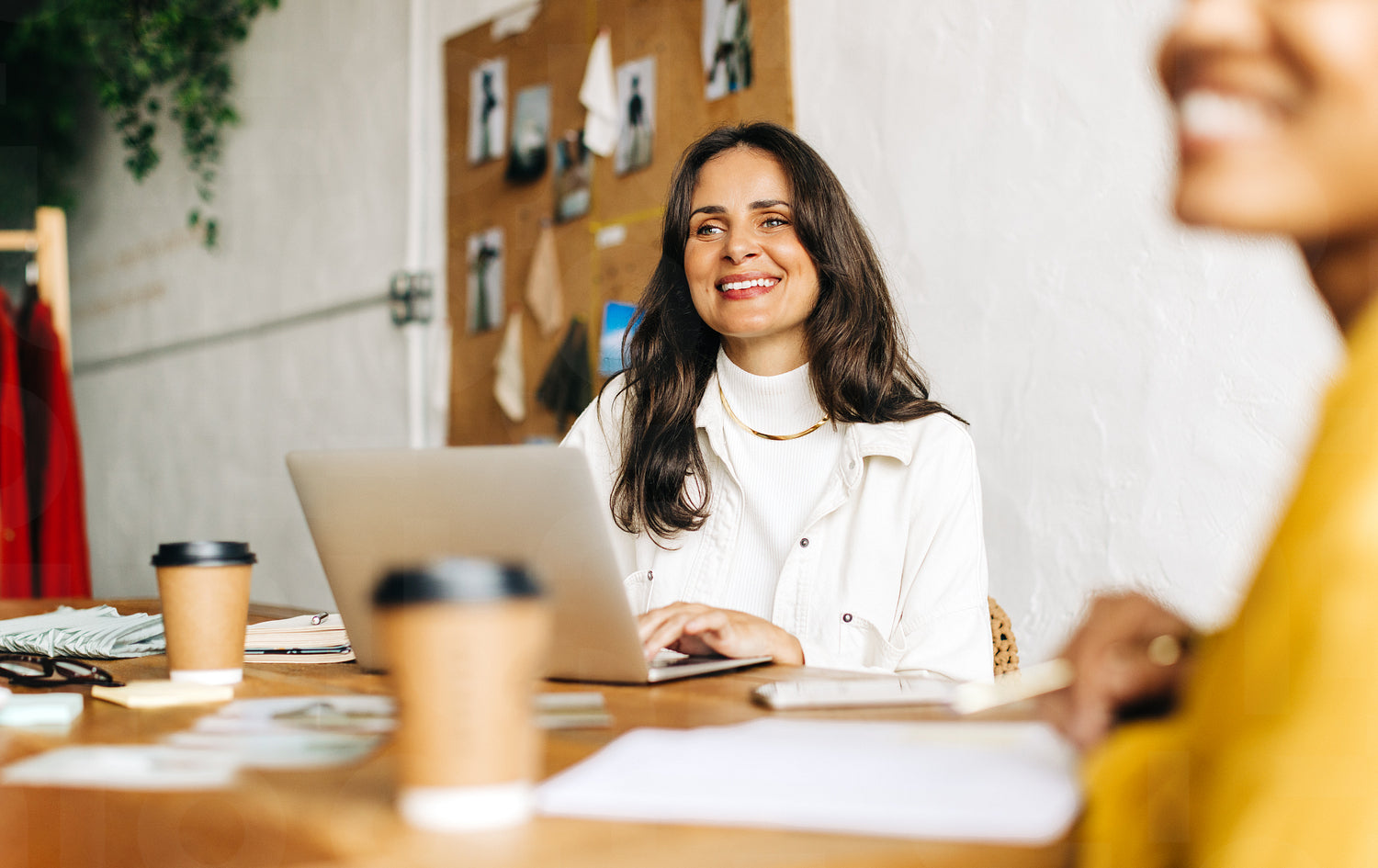 Fashion design team working in their office, with two colleagues sitting at their desks and engaging in a discussion with a client. Female entrepreneurs using their creativity to build a successful clothing design business.