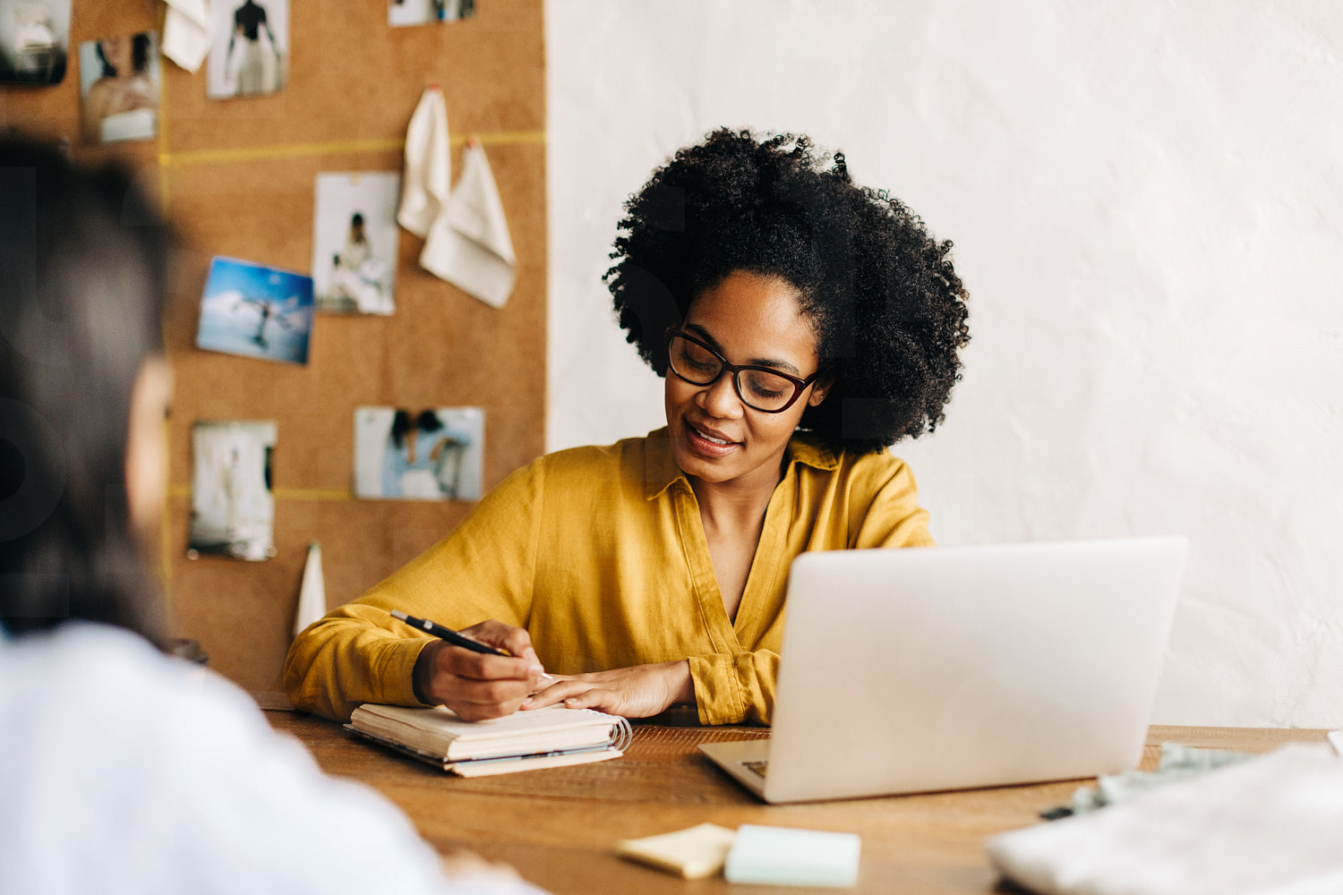 Young, female entrepreneur with an afro is sitting in her office talking to a client while writing notes on her notebook. She is using creativity and conversation to help grow her fashion design business.