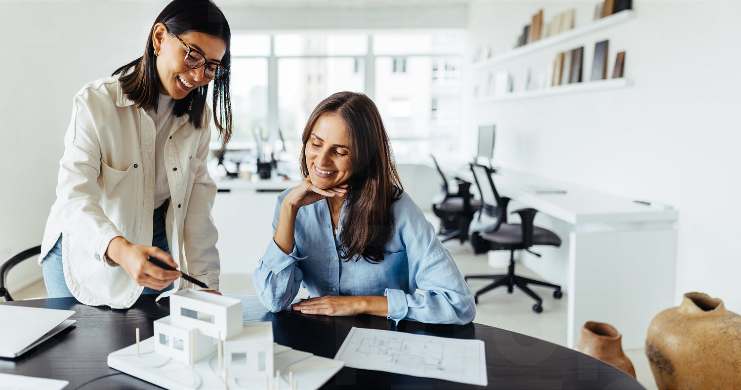 Two female architects discussing a 3D house model in an office. Creative business women collaborating on a new design project.