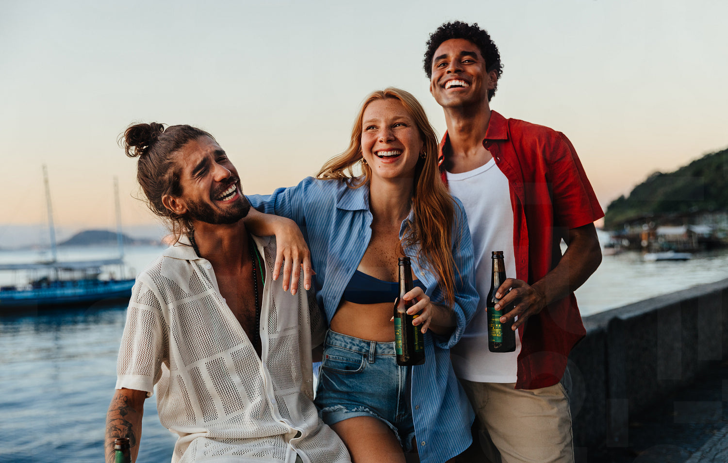 A joyful group of friends laughs and relaxes by the water at Urca’s Wall during sunset. The trio holds beverages and expresses happiness, capturing a moment of carefree leisure and togetherness.