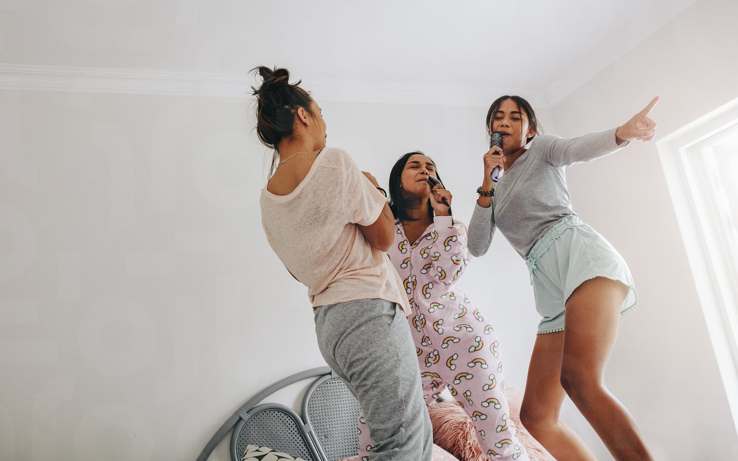 Girls at a sleepover singing and dancing