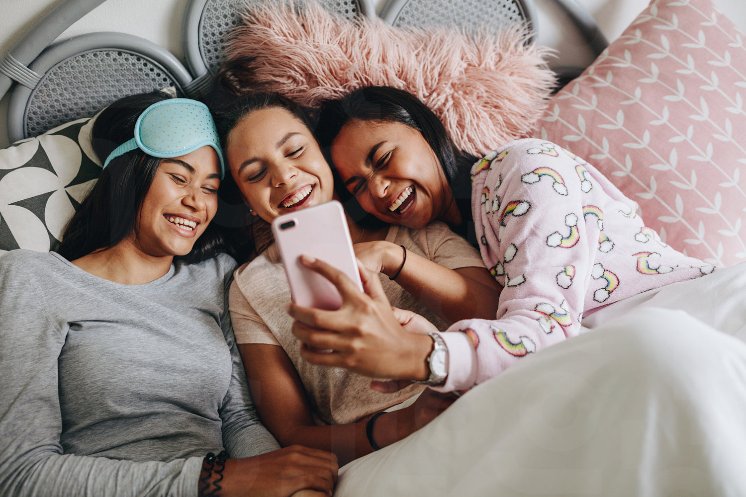 Three young girls watching a movie on mobile phone lying on bed during a sleepover. Girl friends lying on bed laughing while looking at a mobile phone.