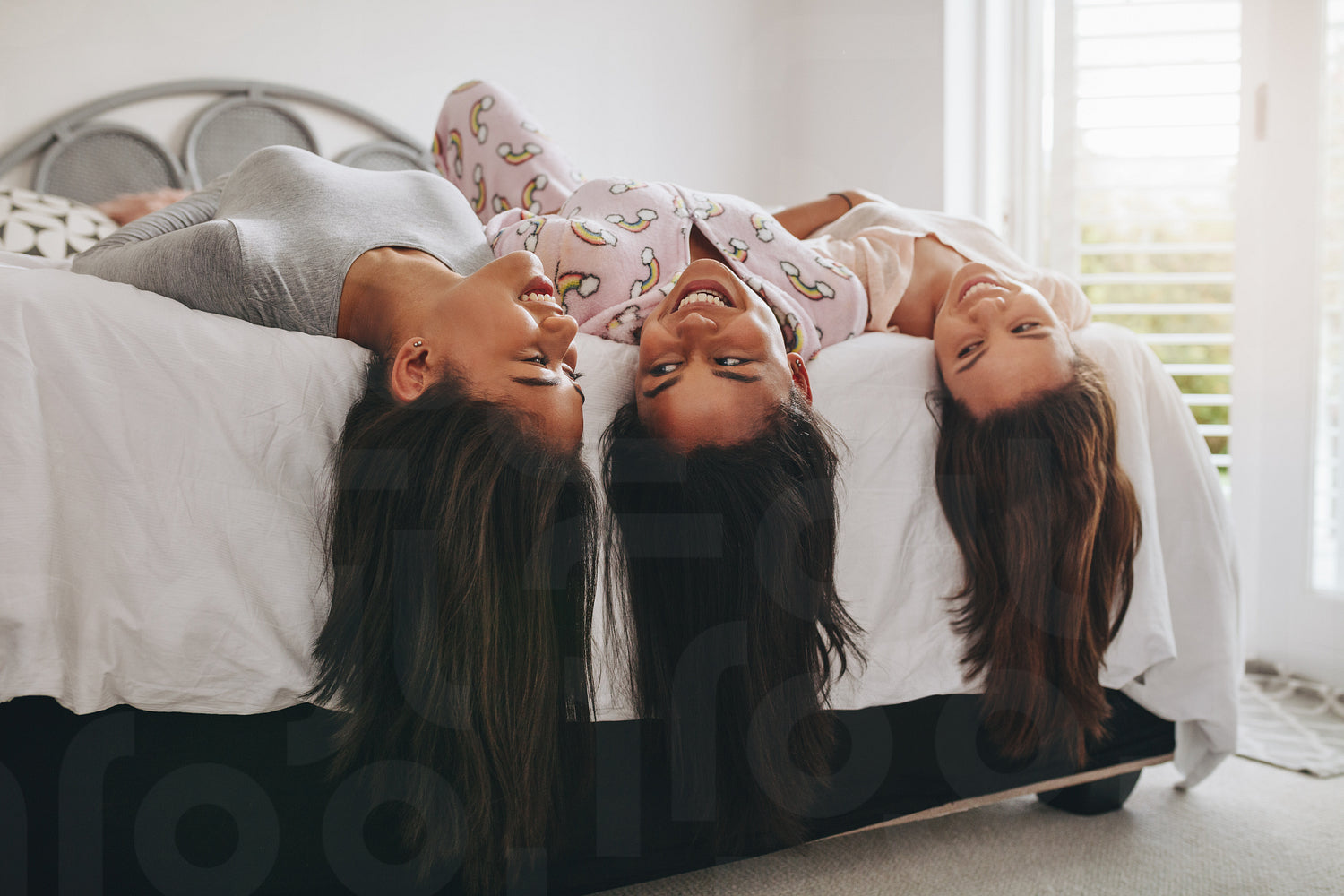 Young girls lying on the edge of bed with their hair hanging down. Smiling girls at a sleepover lying on bed talking to each other.
