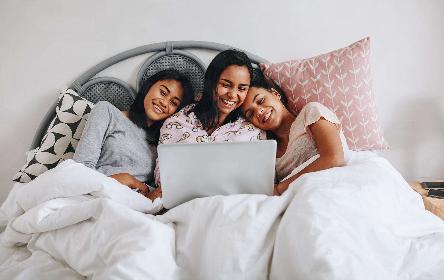 Girl friends having a happy time during a sleepover watching a movie on laptop. Smiling girls sitting on bed with laptop enjoying their sleepover.