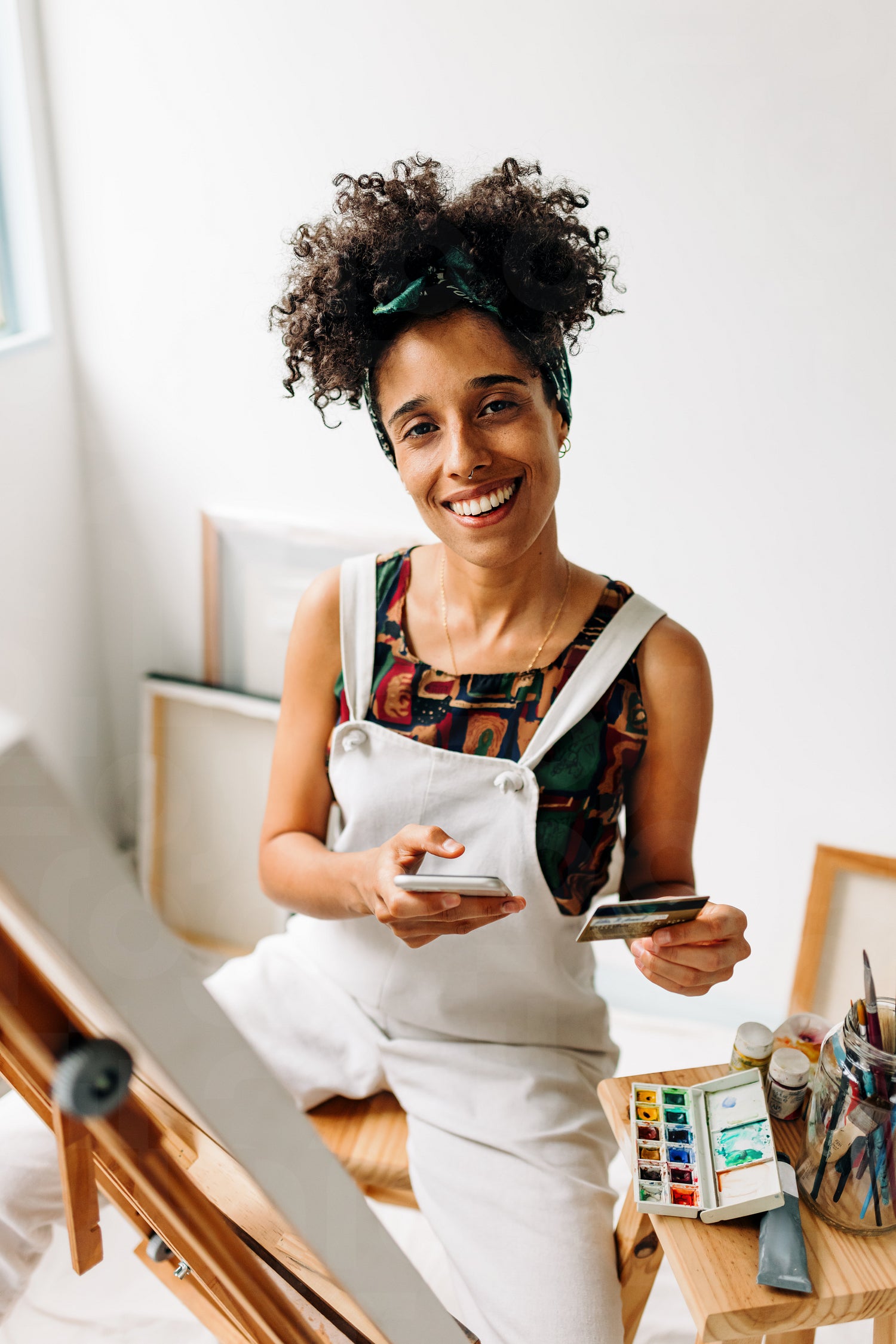 Shopping for the art studio. Happy young female painter shopping online with her credit card and smartphone. Young female painter smiling at the camera while sitting in front of her canvas.