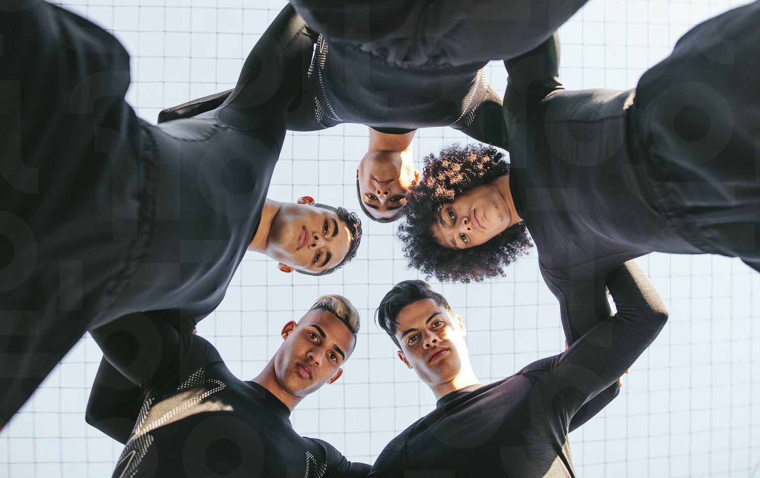 Low angle view of five a side football team huddle. Young soccer player standing in a circle.