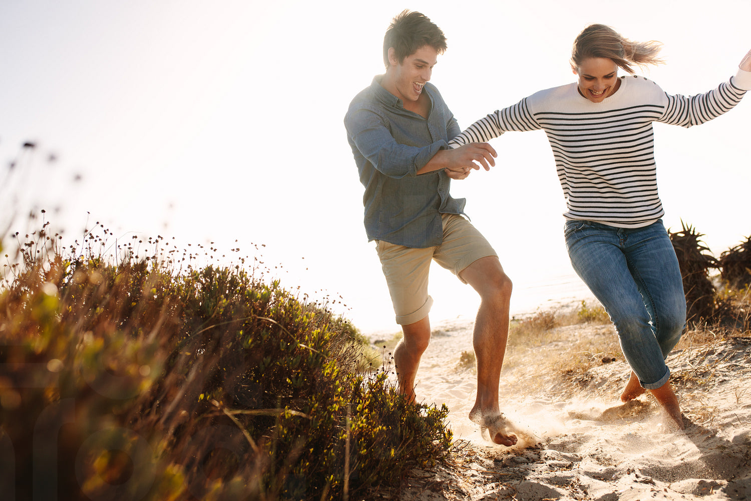 Happy man and woman running on the beach having fun. Couple playing and running in the sand near sea shore on a sunny day.