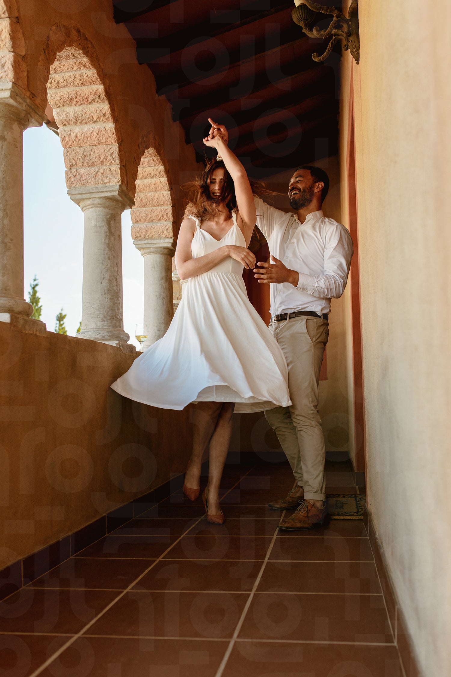 Happy couple dancing in the balcony of a building. Smiling man and woman on a date dancing together.