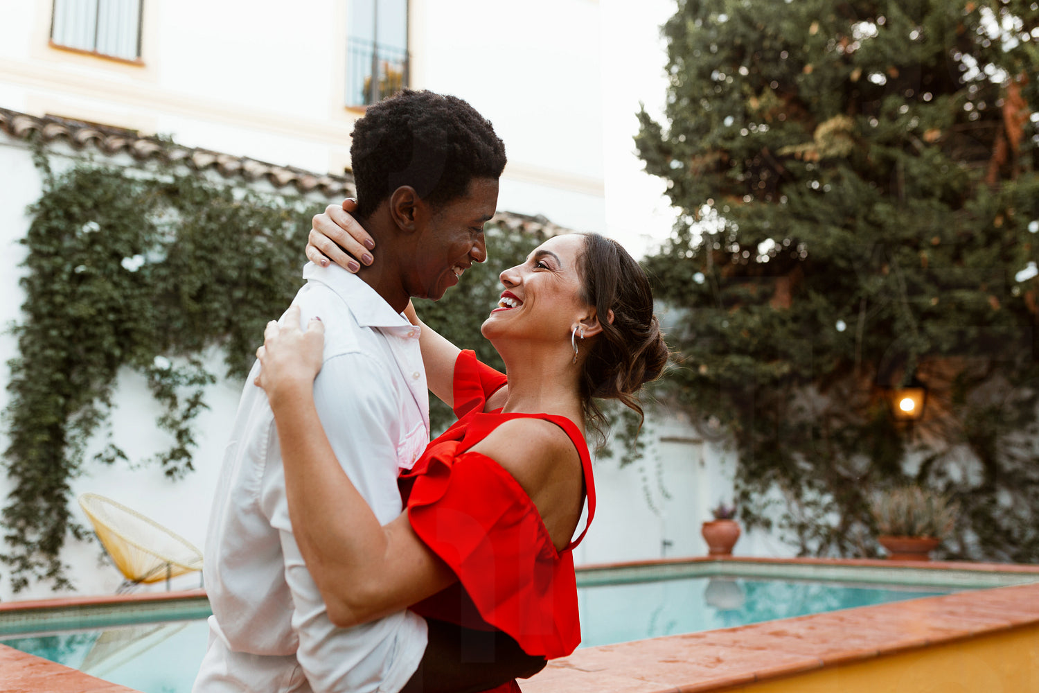 Carefree couple sharing a romantic moment at a holiday resort. Happy young couple smiling at each other while embracing. Cheerful interracial couple standing next to a swimming pool.