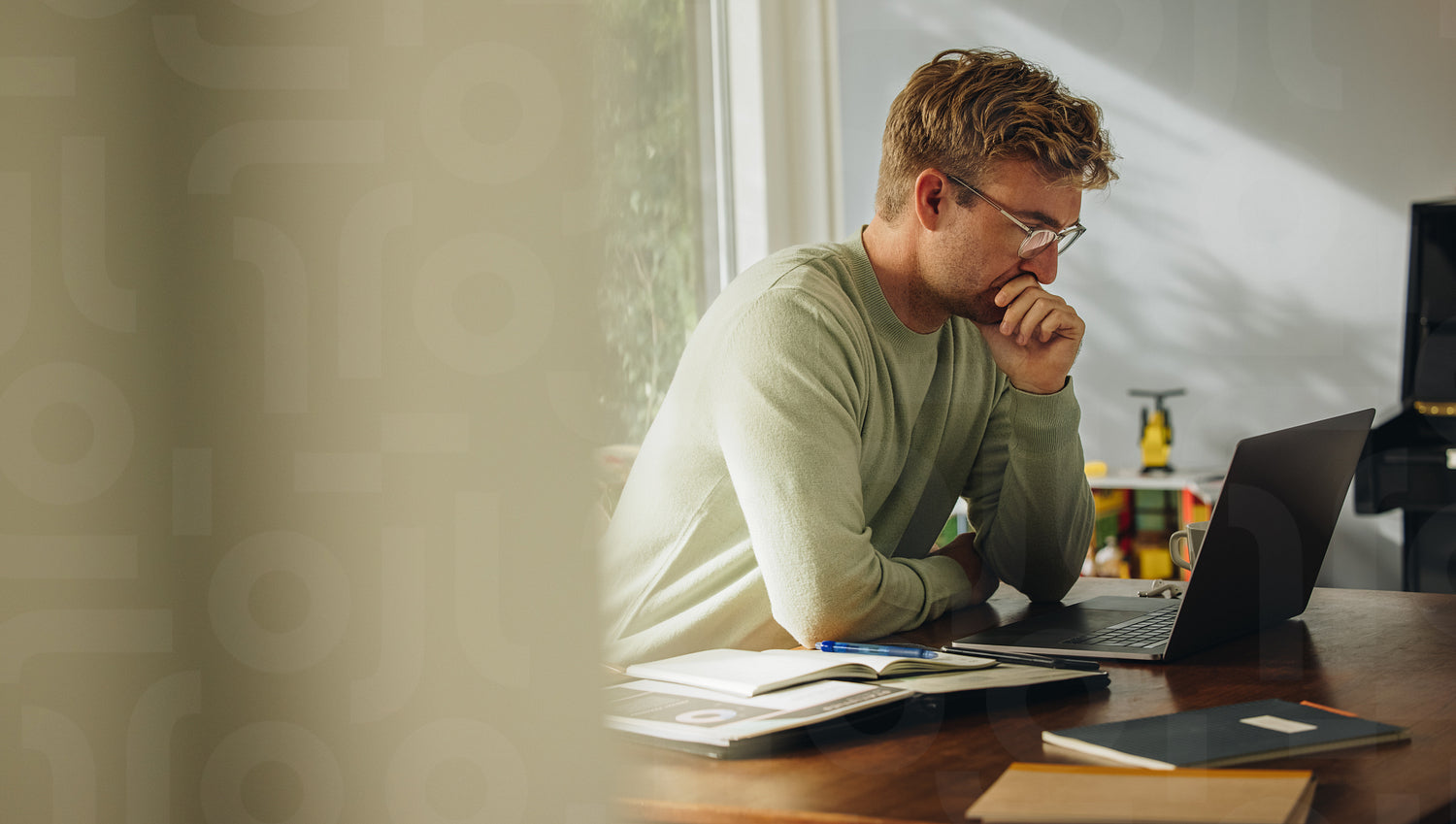 Man sitting at table and looking laptop with hand on chin. Man working on laptop and thinking.