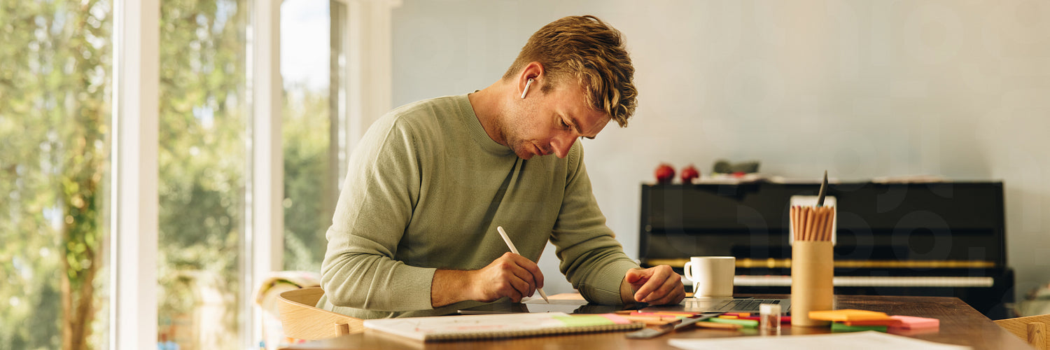 Male artist working from home. Man preparing some illustrations on digital tablet.
