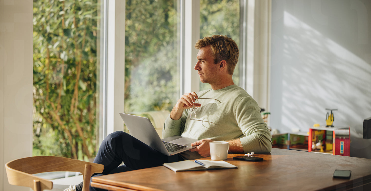 Thoughtful man with laptop at home. Man sitting by table with laptop and looking away thinking.