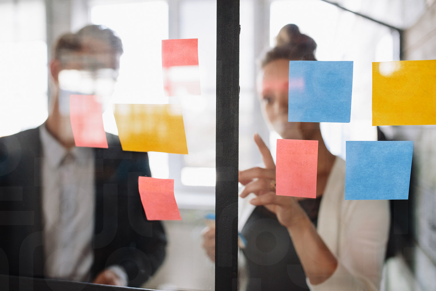 Two business colleagues working on project together. Business woman pointing at sticky note to male colleague on glass wall in office.