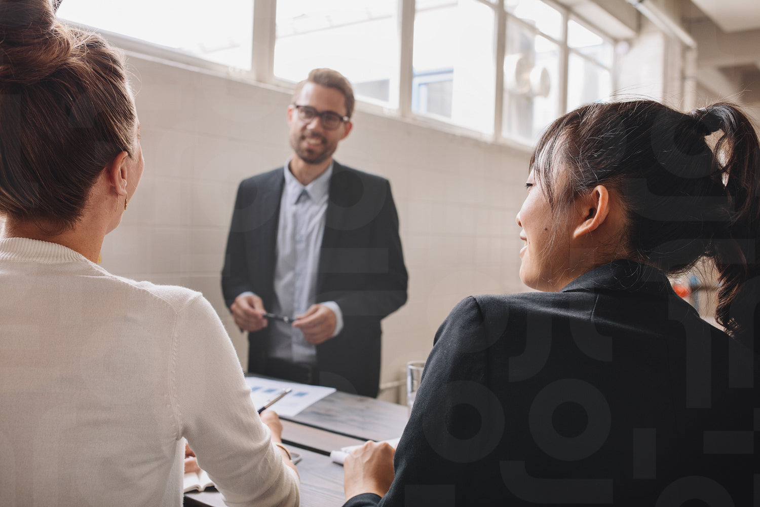 Two young woman sitting in a meeting in office, with businessman standing in background. Business presentation in meeting room.
