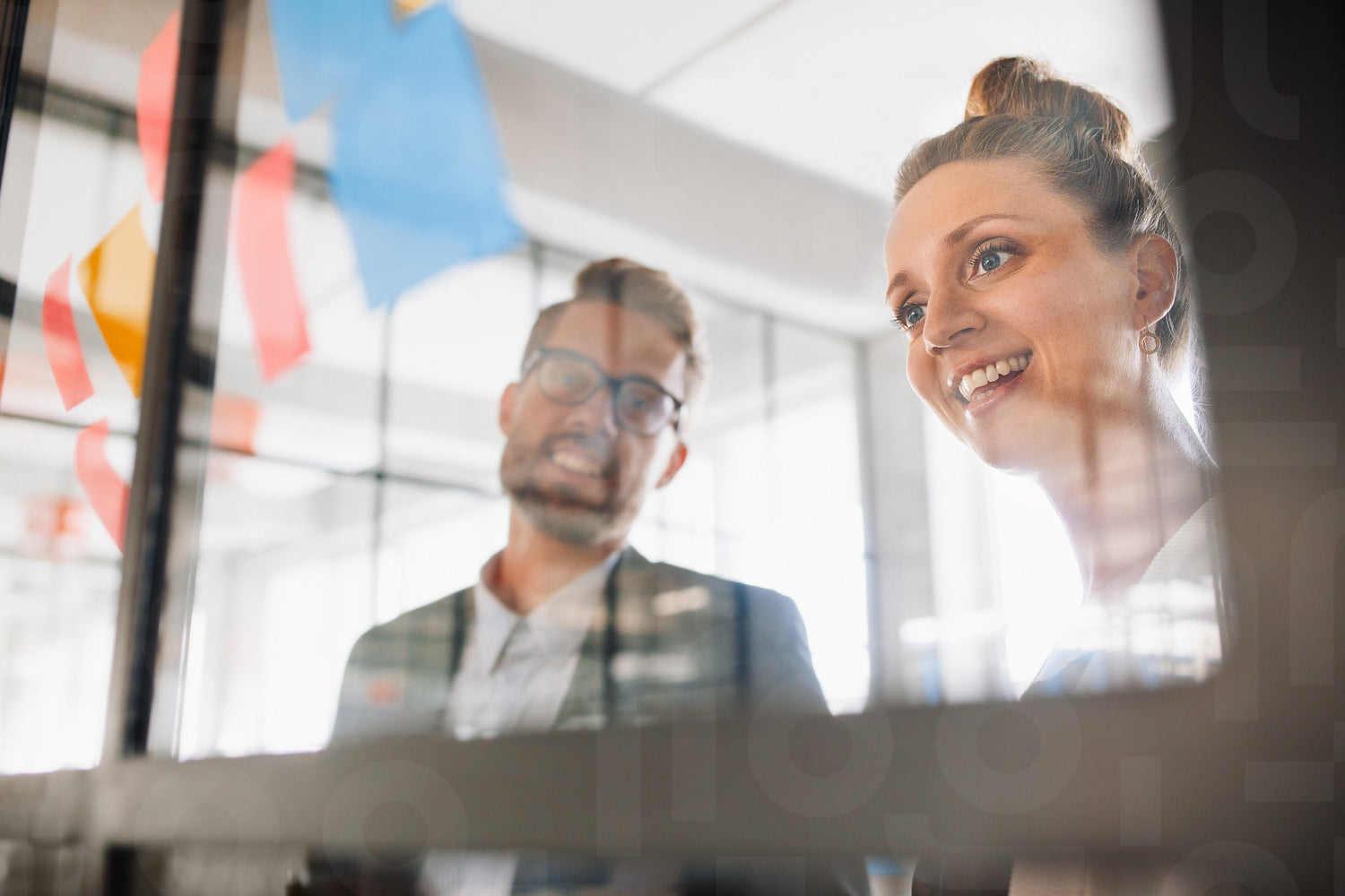 Portrait of two young professionals looking over adhesive notes on glass wall and brainstorming. Young man and women standing at the office behind glass wall with sticky notes.