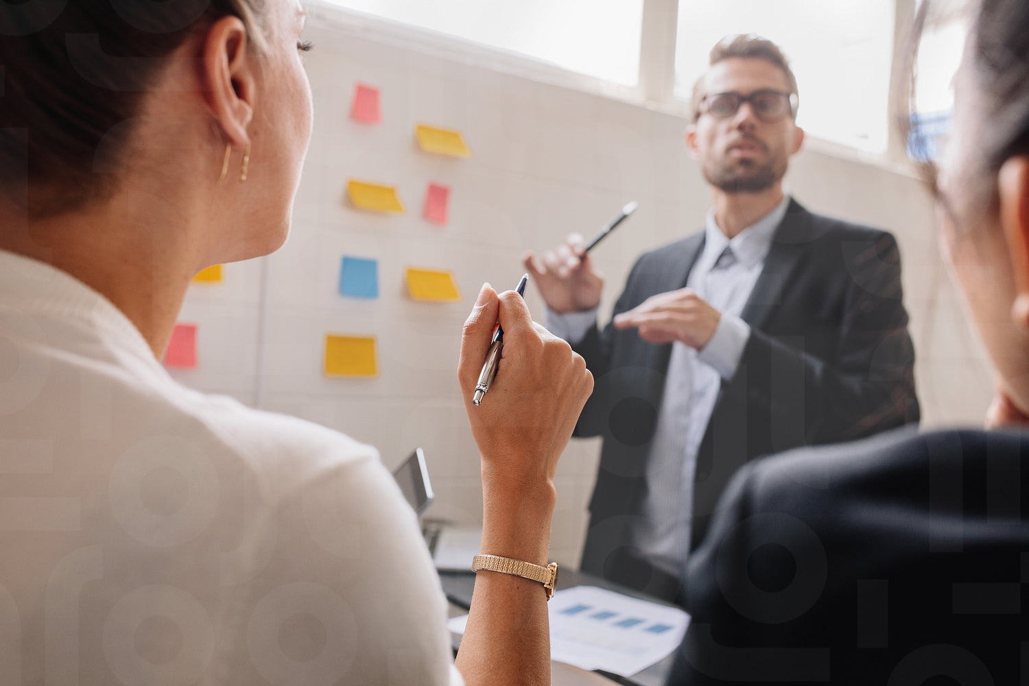 Close up shot of woman listening to businessman during a business presentation, with focus on hand of woman.