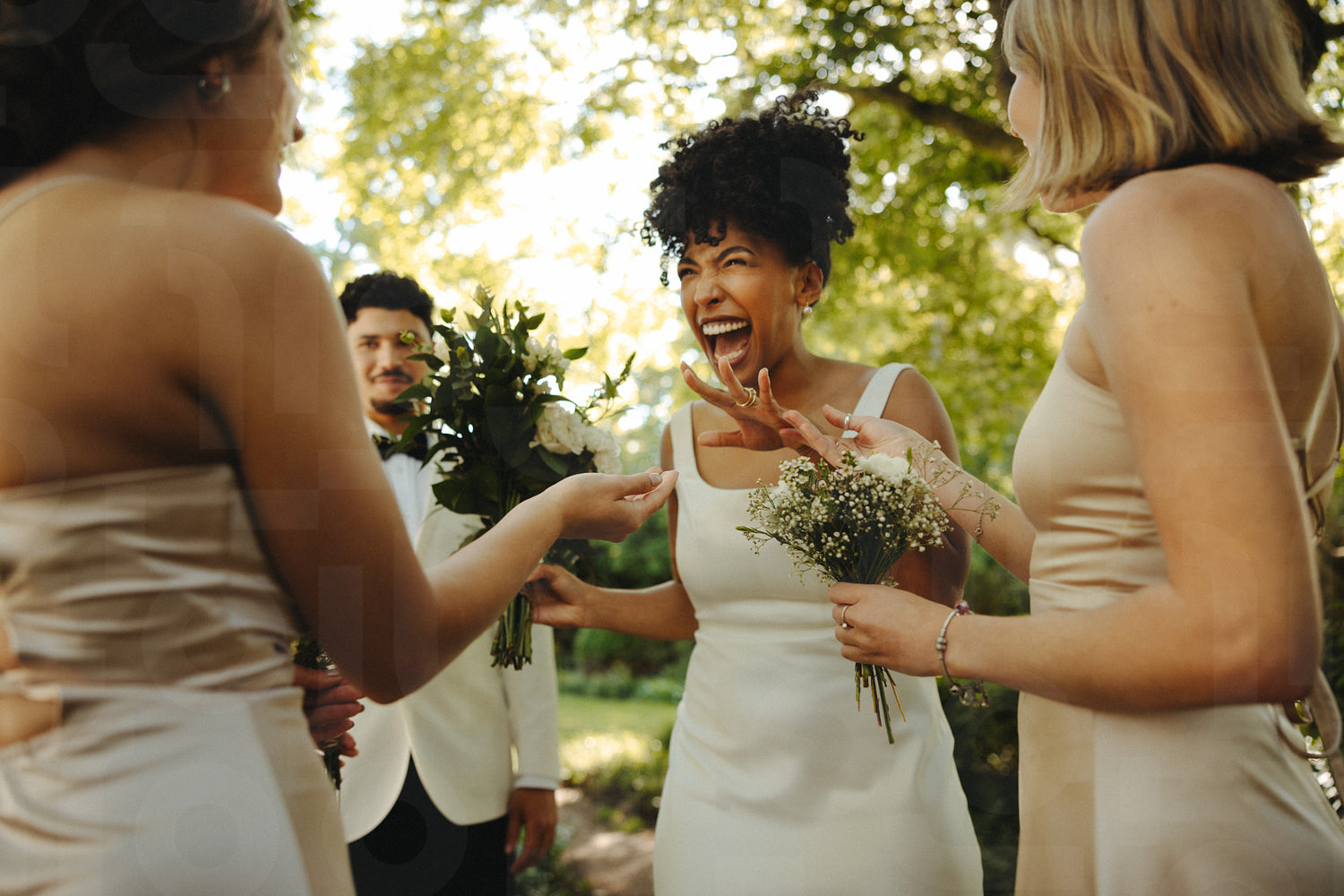 Bride celebrating joyous wedding moment with bridesmaids and nature backdrop