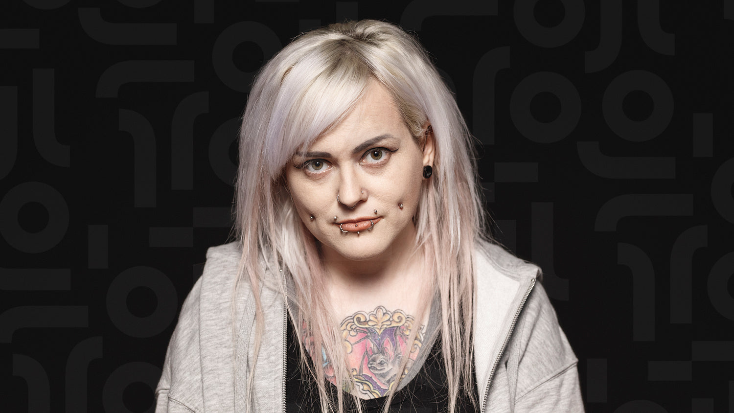 Woman with fashion piercing on lips and cheeks isolated on black background. Woman with white hair and tattoo on body looking at camera.