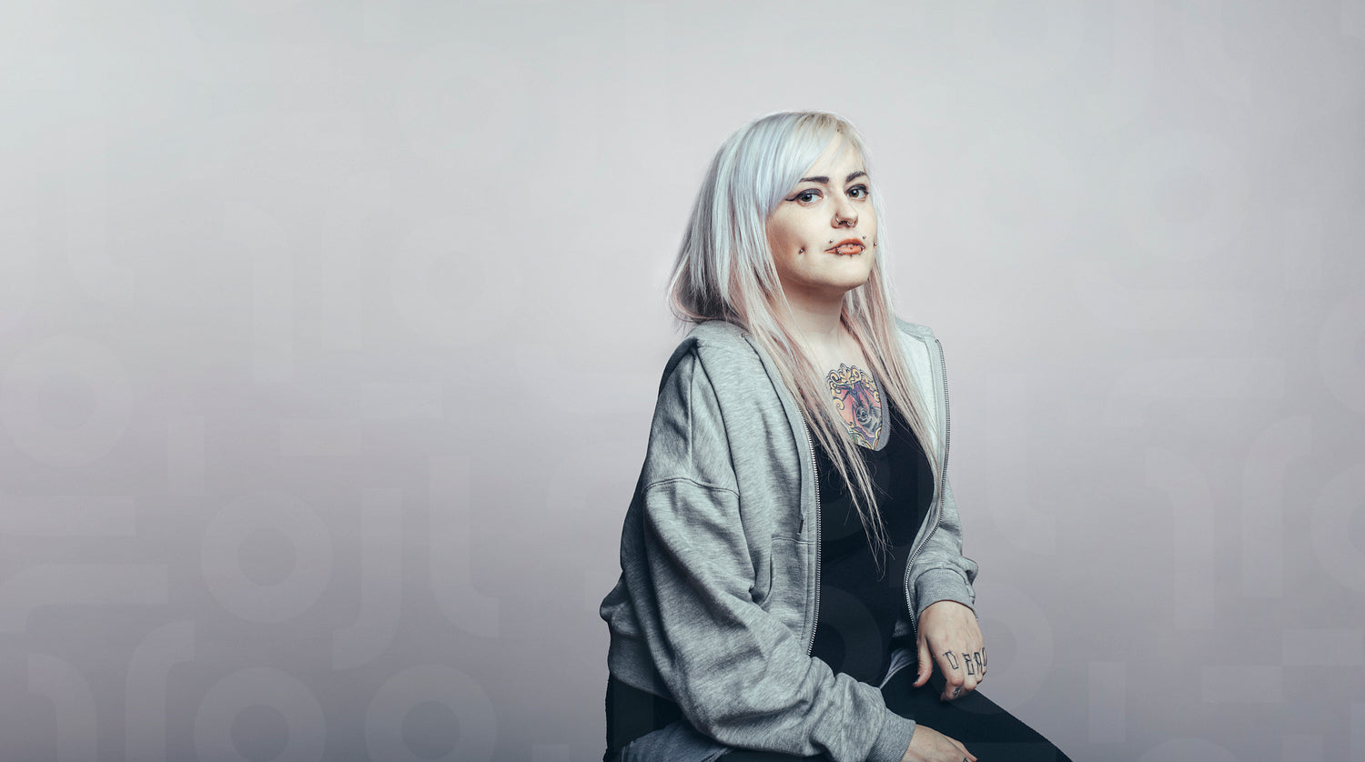 Side view of a fashionable woman in white hair looking at camera. Woman with fashion piercing on cheeks isolated on grey background.
