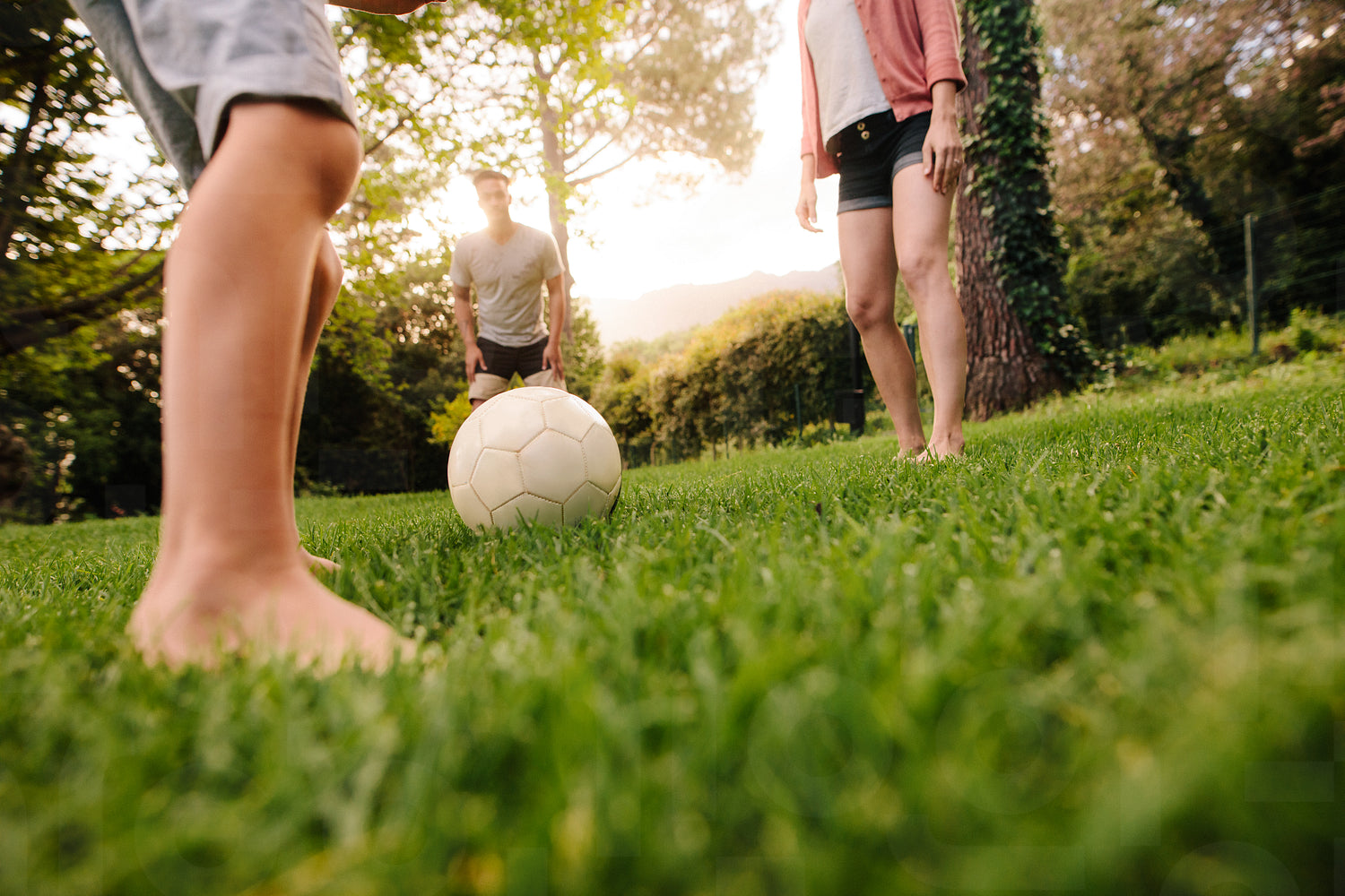 Football on grass with family standing around outdoors in park. Legs of little boy about to play football with his parents in garden.