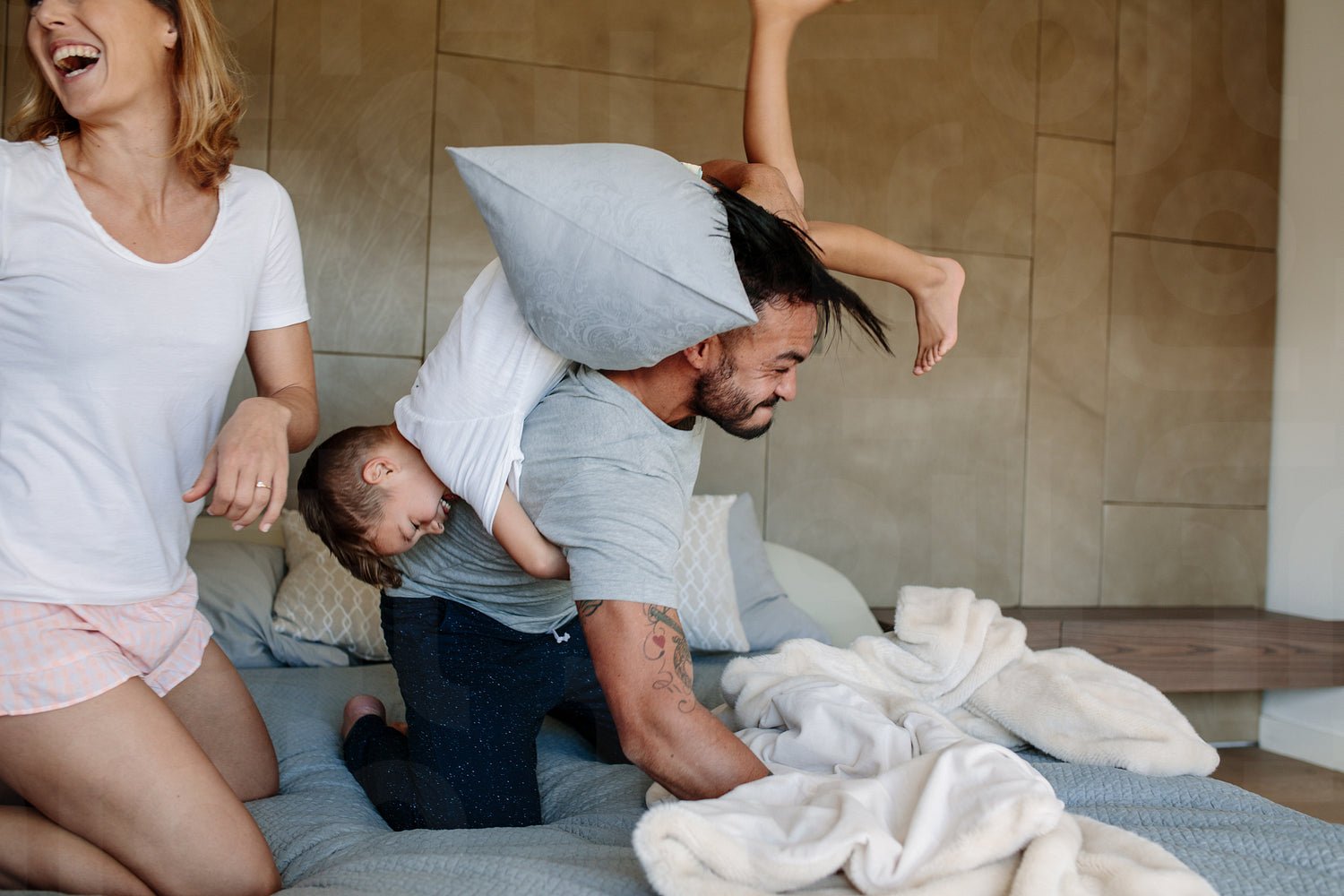 Family playing together on bed at home. Little boy playing with his parents in bedroom.