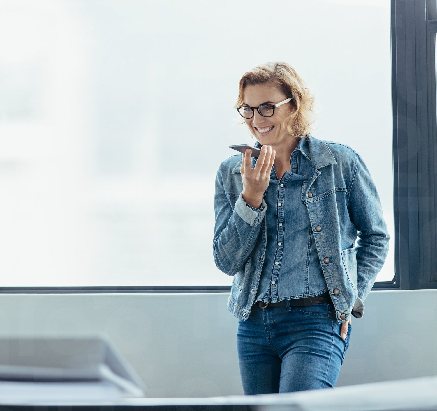 Female executive talking on speaker phone. Businesswoman speaking on cellphone while standing in office.