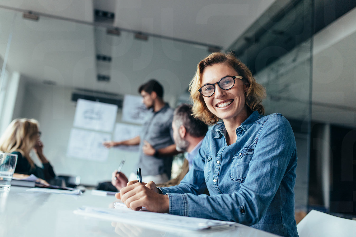 Smiling business woman sitting in conference room during presentation. Caucasian woman sitting in board room.