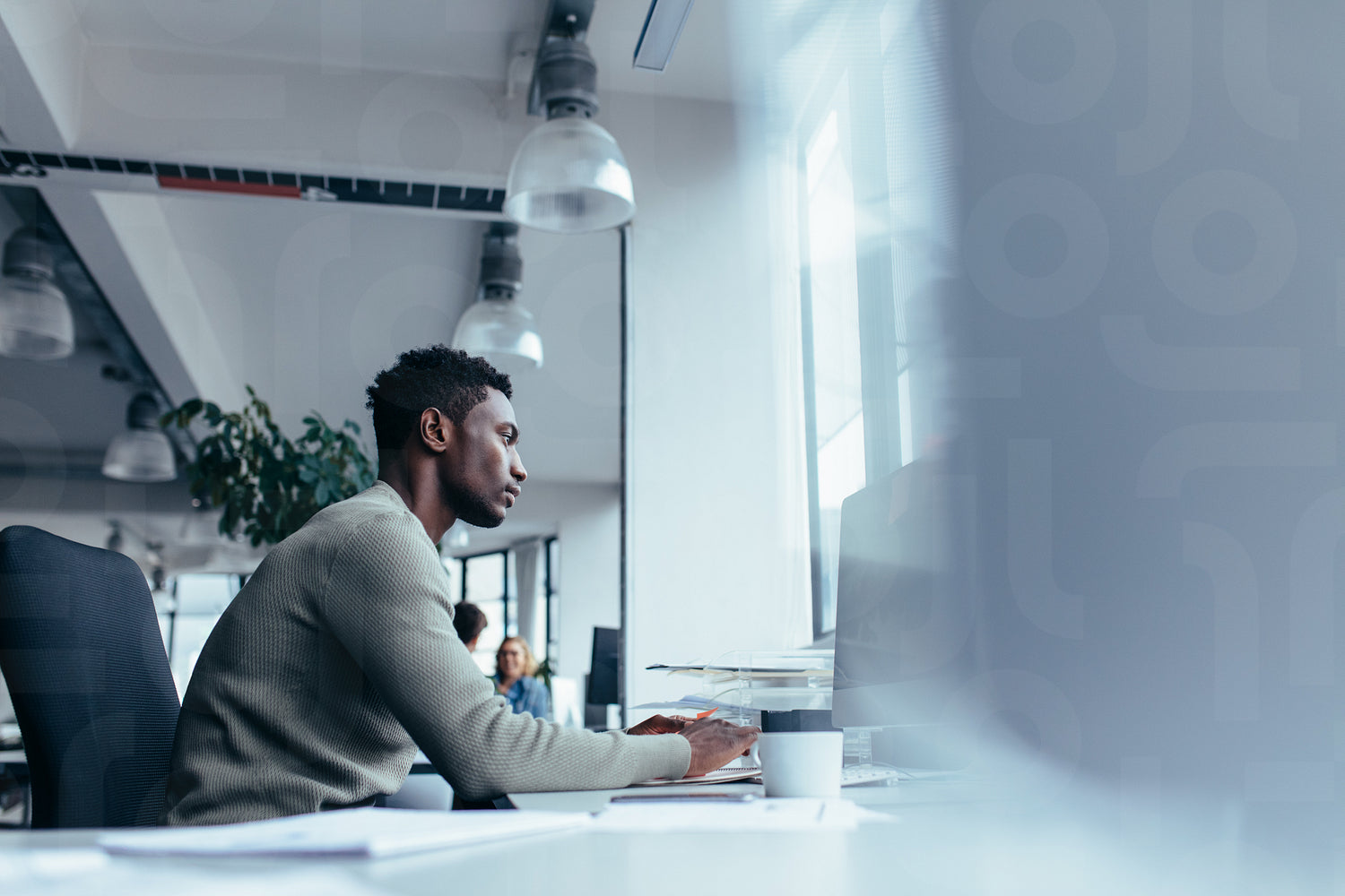 Side view of young african man working in office. Male executive sitting at his desk and working on desktop computer.