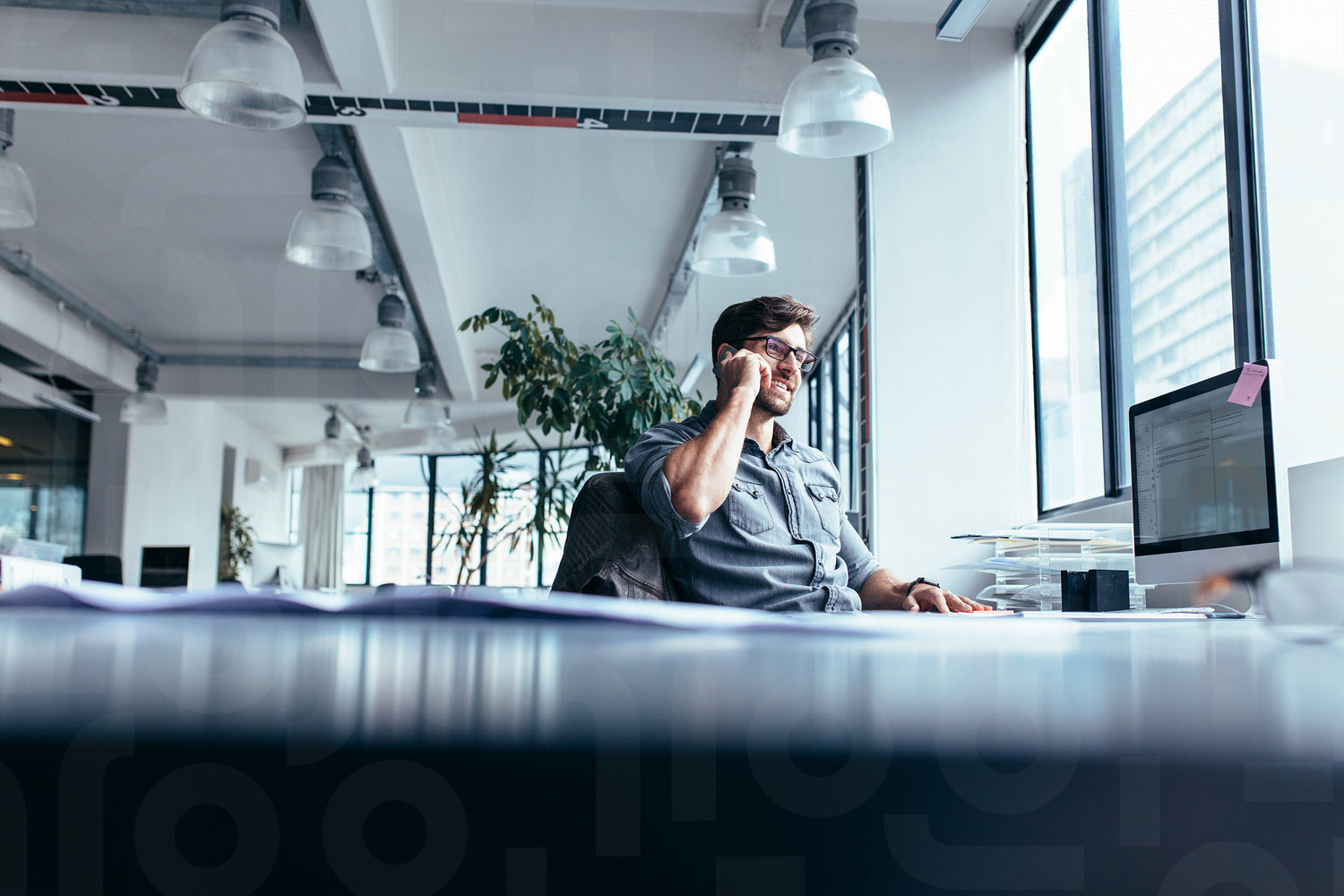 Young businessman talking on cellphone in modern office. Caucasian male sitting at his desk in office.