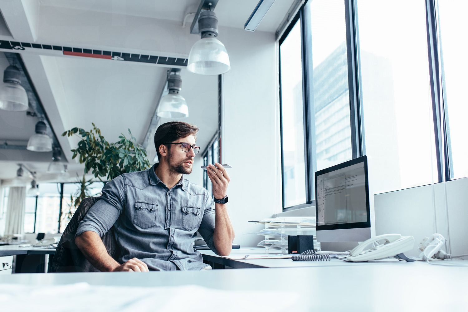 Serious young businessman sitting and talking on mobile phone in office. Creative professional sitting at his workplace.