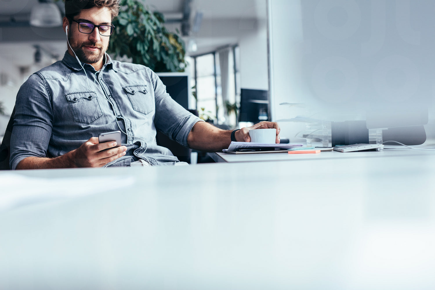Young businessman using smart phone at his work place. Caucasian young man listening music from his mobile phone.