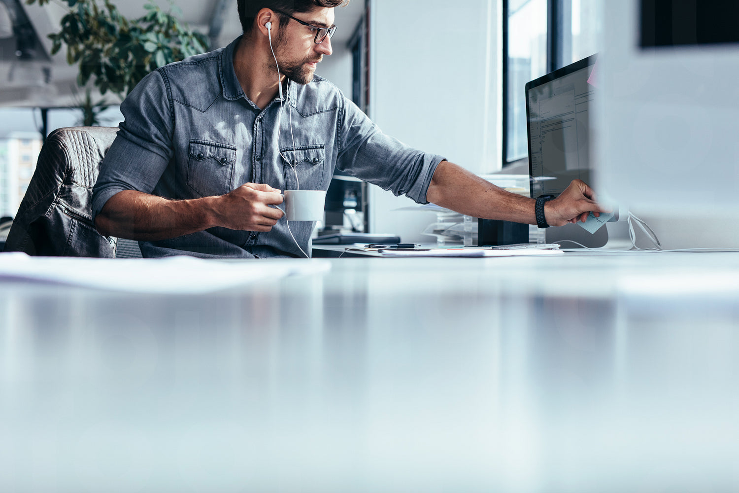 Young designer listening music with cup of coffee and working. Businessman sitting in office putting adhesive note on monitor.