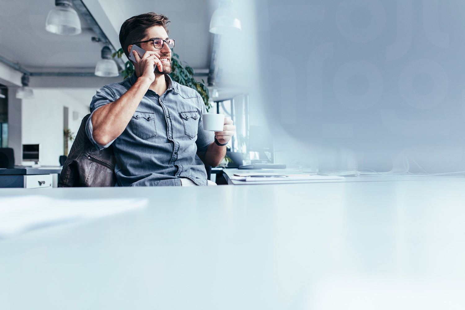 Young man with cup of coffee and talking on mobile phone. Male designer sitting in office having coffee and making phone call.