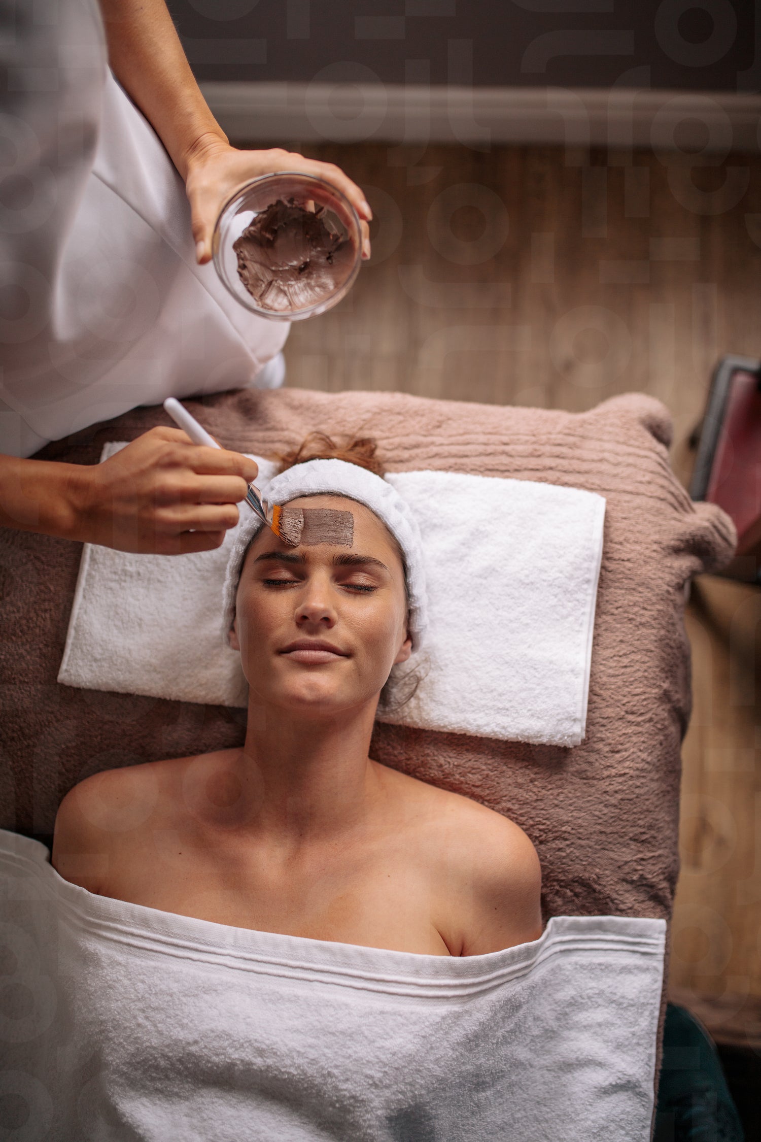 Top view shot of beautiful woman receiving a face mask treatment in a beauty spa by therapist. Experienced cosmetician applying facial mask on female face.