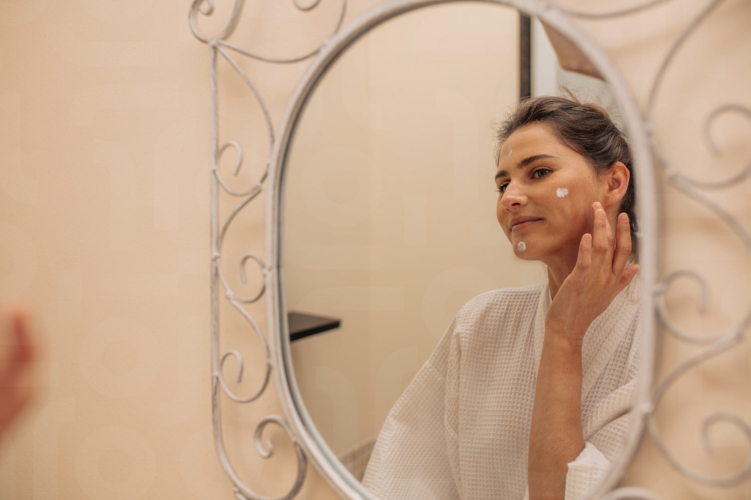 Woman applying moisturizer cream on face while in the bathroom. Reflection of female looking in to the mirror and putting cosmetic lotion on her face.