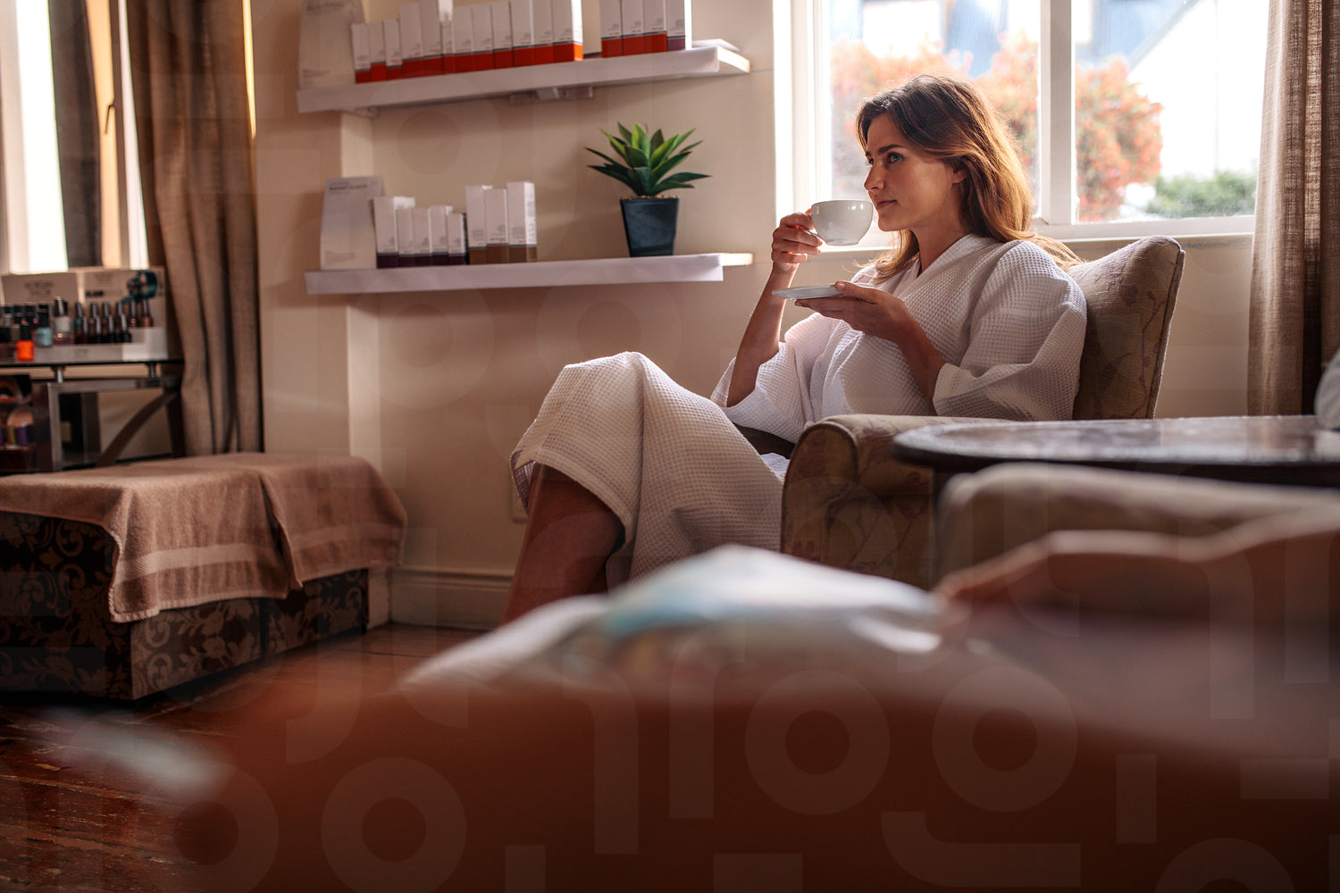 Woman in bathrobe sitting on chair and drinking coffee while waiting for spa. Relaxed female having coffee at health spa.