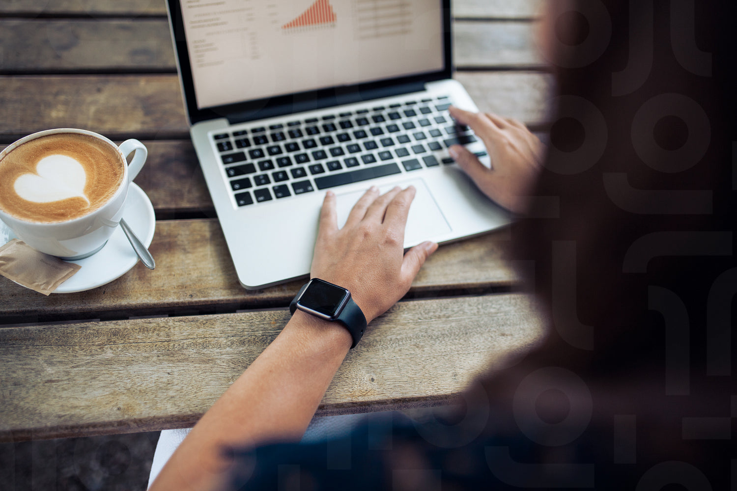 Woman typing on keyboard of a laptop with a coffee cup on wooden table. Female wearing a smartwatch at cafe.