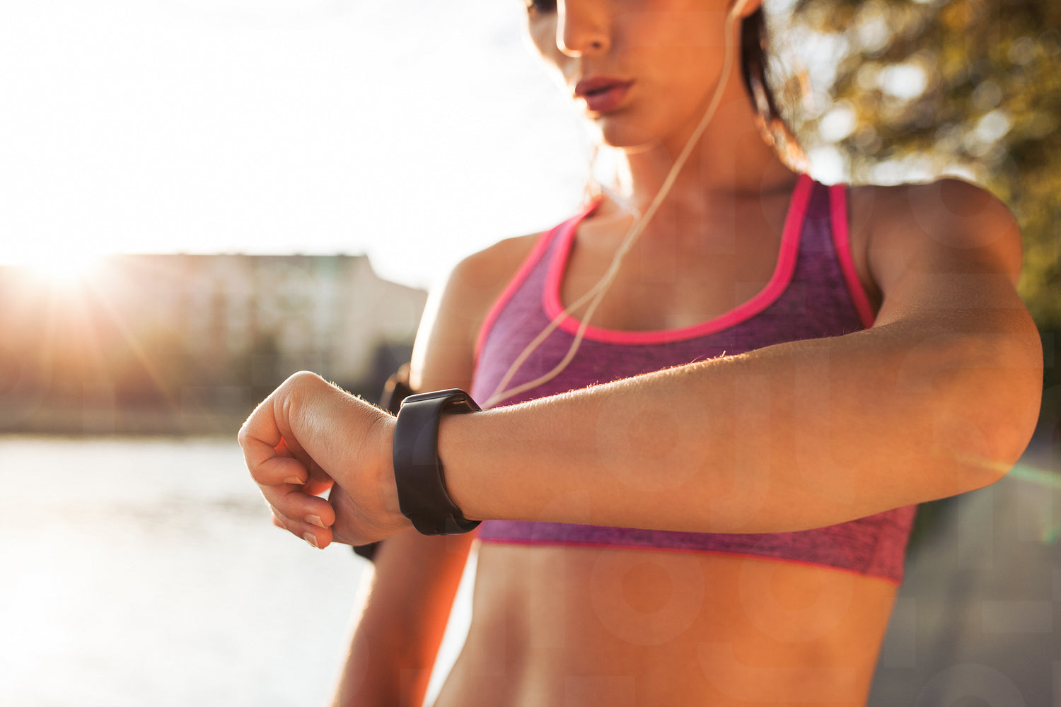 Young fitness woman looking at her smart watch while taking a break from outdoor workout. Sportwoman checking pulse on fitness smart watch device.