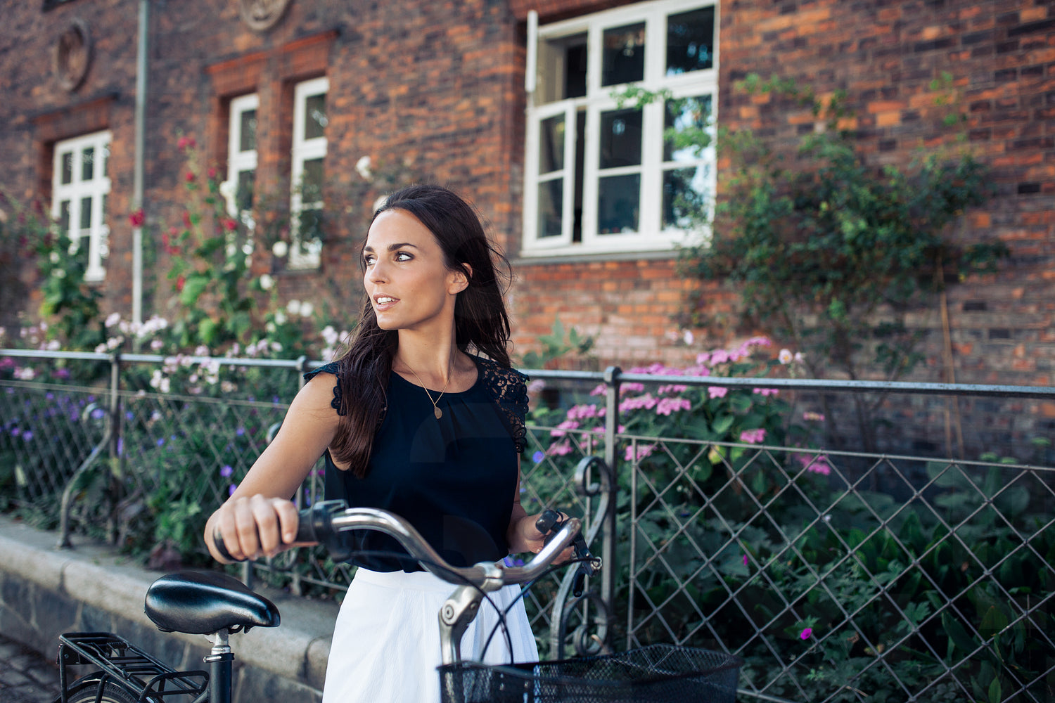 Outdoor shot of young woman walking along the road with a bicycle looking away. Woman with bike walking down the street in the city.