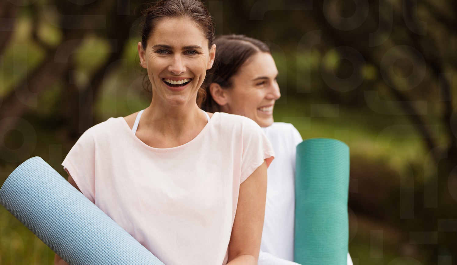 Two smiling fitness women standing in park holding yoga mats. Women going outdoors for a workout.